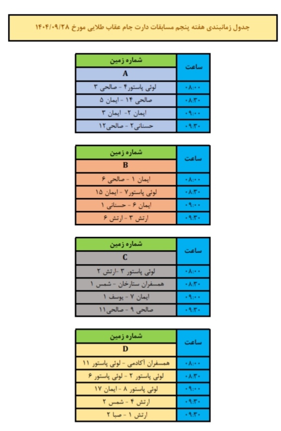 هفته پنجم مسابقات دارت بوستان طالقانی جام عقاب طلایی 1404 در رو جمعه به مورخ1404/09/28 برگزار می گردد که برنامه آن به شرح ذیل میباشد: