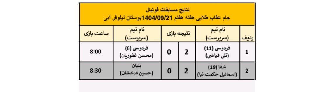 هفته هفتم مسابقات فوتبال جام عقاب طلایی ۱۴۰۴ با انجام ۲ بازی روز جمعه 21 آذر ماه در بوستان نیلوفرآبی آغاز و نتایج زیر بدست آمد.