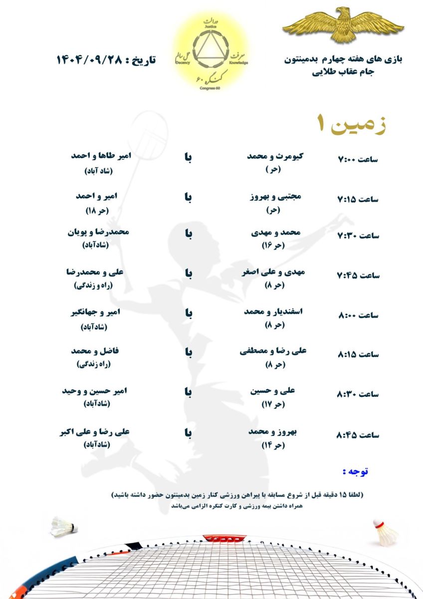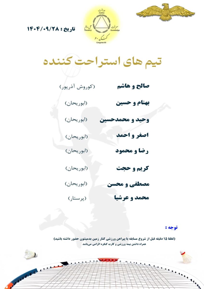 تربیت بدنی برنامه مسابقات بدمینتون جام عقاب طلایی کنگره ۶۰ در بوستان ولایت منبع: پارک ولایت (تهران) پنج شنبه 27 آذر 1404 تعداد بازدید از این مطلب : 66 برنامه هفته چهارم مسابقات بدمینتون جام عقاب طلایی کنگره ۶۰ در بوستان ولایت مورخ 1404/09/28 بار گذاری : مرزبان خبری (مسافر رحمان) منبع: پارک ولایت (تهران) پنج شنبه 27 آذر 1404 تعداد بازدید از این مطلب : 66 ویژه ها هشدار نایدا: وقفه در بروزرسانی و ارائه برخی از خدمات به دلیل وقفه در تأمین بودجۀ دولتی امریکا پذیرش مقاله مهندس حسین دژاکام برای ارائه در کنفرانس "مراقبت از اعصاب"،شیکاگو، امریکا (2026) گامی سرنوشتساز از سوی مهندس حسین دژاکام در درمان کووید-۱۹ و سارس مقاله "تأثیرات رفتاری و مولکولی پروتکل دی اس تی بر مدل حیوانی اعتیاد به تریاک" از مهندس حسین دژاکام، درصدر محافل علمی دنیا مورد بررسی و پذیرش قرار گر ارائه مقاله جدید و برجسته مهندس حسین دژاکام در حوزه درمان اعتیاد با روش DST با دقت سلولی مولکولی در کنفرانس بین المللی درمان اعتیاد در اورلاندو، فلوری دستاورد شگفتآور دیگری از تیم تحقیقاتی کنگره 60 در ریسرچ گیت منتشر گردید. دستاورد شگفت آور دیگری از کنگره 60، انتشار مقاله مهار متاستاز سرطان سینه به صورت short communication رویکردی نوین در درمان سرطان