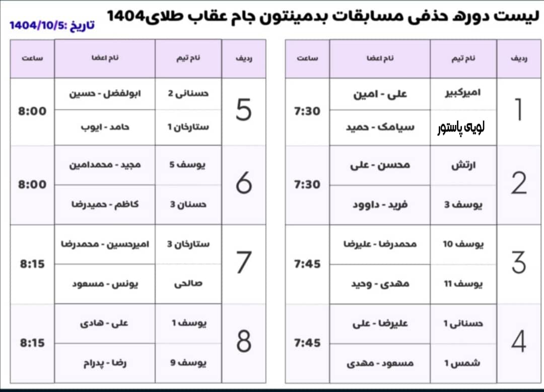 دوره حذفی از مسابقات بدمینتون پارک طالقانی تهران روز جمعه مورخ 1404/10/05 برگزار خواهد شد.