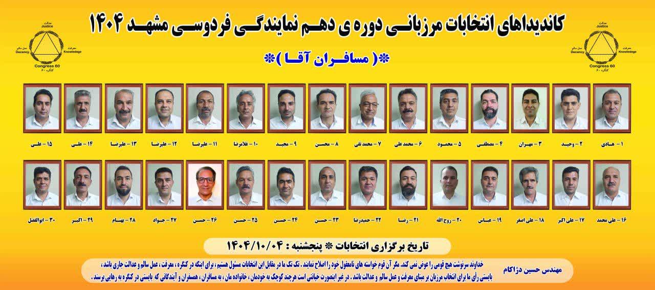 بدینوسیله به اطلاع میرسانیم دهمین دوره انتخابات مرزبانی نمایندگی فردوسی مشهد در روز پنجشنبه 4 دیماه ۱۴۰4 ساعت ۱۵برگزار میگردد.