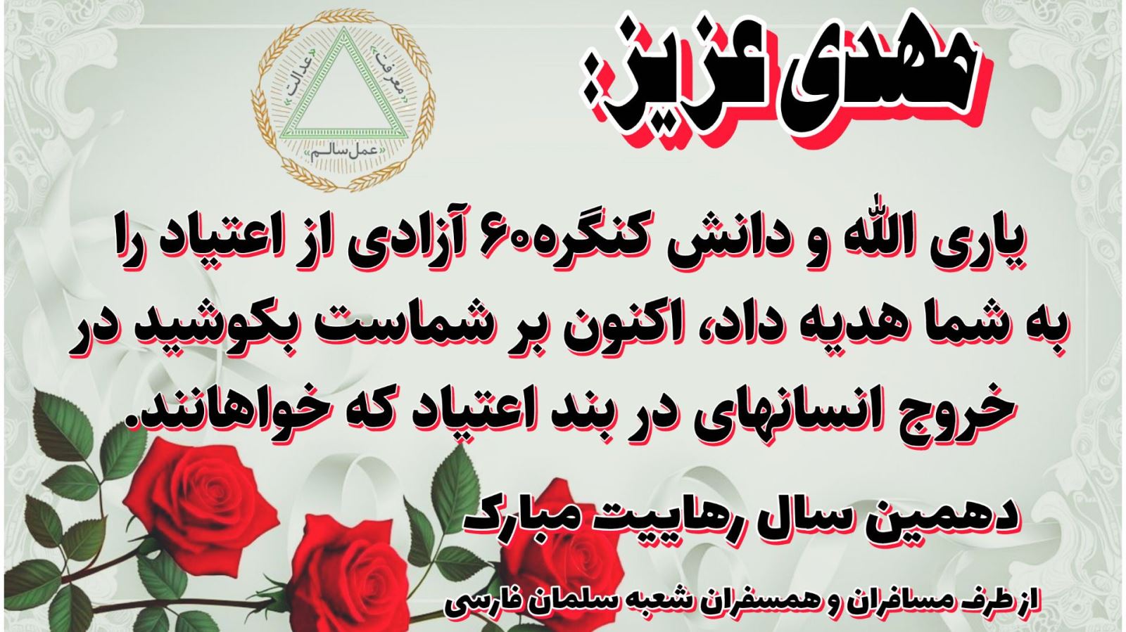 امروز ۴ماه است که شاهد رهایی از بند نیکوتین ایشان هستیم، قبلاً تمایلی نداشتند که وارد لژیون سیگار شوند و درمان سیگار خود را آغاز نمایند و پس از گذشت چندین سال برای درمان سیگار اقدام نمود، من افتخار داشتم در لژیون ویلیام خدمت ایشان باشم و به این حال خوش امروز برسد. عزیزانی که درمان سیگار را هیچ و پوچ میدانند بهترین کادو برای همسفران در هفته آینده، درمان سیگار میباشد امروز شاهد دهمین سالگرد رهایی آقا مهدی هستیم و از طرف خودم و تکتک شما عزیزان و همهی خدمتگزاران کنگره۶۰، راهنمای سفر اول ایشان آقای اصغر منصوری، راهنمای دوم آقای مهدی فروهر، همسفر محترم، راهنمای همسفر ایشان و در رأس خدمت آقای مهندس دژاکام و خانواده محترم ایشان این تولد و این دهسالگی را تبریک و خدا قوت عرض مینمایم.