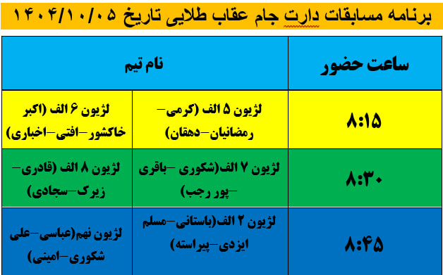 برنامه مسابقات دارت جام عقاب طلایی به شرح جدول زیر اعلام می گردد :