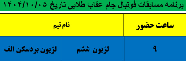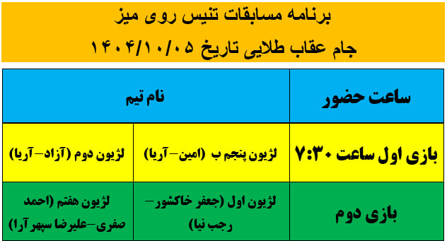 برنامه مسابقات تنیس روی میز جام عقاب طلایی به شرح جدول زیر اعلام می گردد: