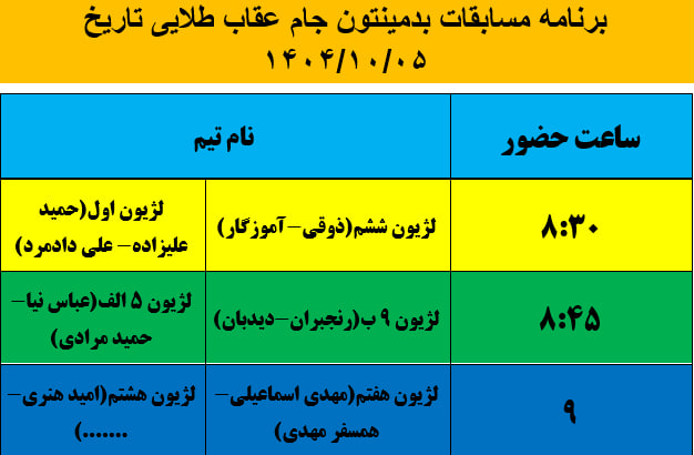 برنامه مسابقات بدمینتون جام عقاب طلایی به شرح جدول زیر اعلام می گردد :