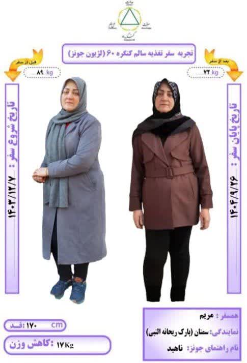 در روز چهارشنبه ۲۶ آذرماه ۱۴۰۴ همسفر مریم رهجوی راهنما همسفر ناهید، نمایندگی سمنان با قد ۱۷۰ سانتیمتر و وزن اولیه ۸۹ کیلوگرم به مدت ۱۰ ماه و ۱۸ روز به روش Dezhakam سفر کردند؛ ۱۷ کیلوگرم کاهش وزن داشتند و به وزن ۷۲ کیلوگرم رسیدند و با دستان پرمهر آقای مهندس آزاد و رها شدند.