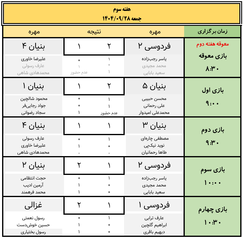 موضوعی که از رقابتی فشرده و پرهیجان در این مسابقات حکایت دارد. تیم صدرنشین بنیان ۳ با امتیازی که در دیدار امروز از دست داد، جایگاه خود را در صدر جدول در معرض تهدید میبیند و ممکن است در هفته آینده شاهد تغییر صدرنشین باشیم. در سوی دیگر، تیم بنیان ۵ با وجود یک بازی کمتر، بازگشتی قدرتمند به جدول داشته و فاصله خود را با رقبا کاهش داده است. همچنین در میانه جدول نیز اختلاف امتیازها بسیار کم بوده و رقابتها با کیفیت و جذابیت بالایی دنبال میشود.