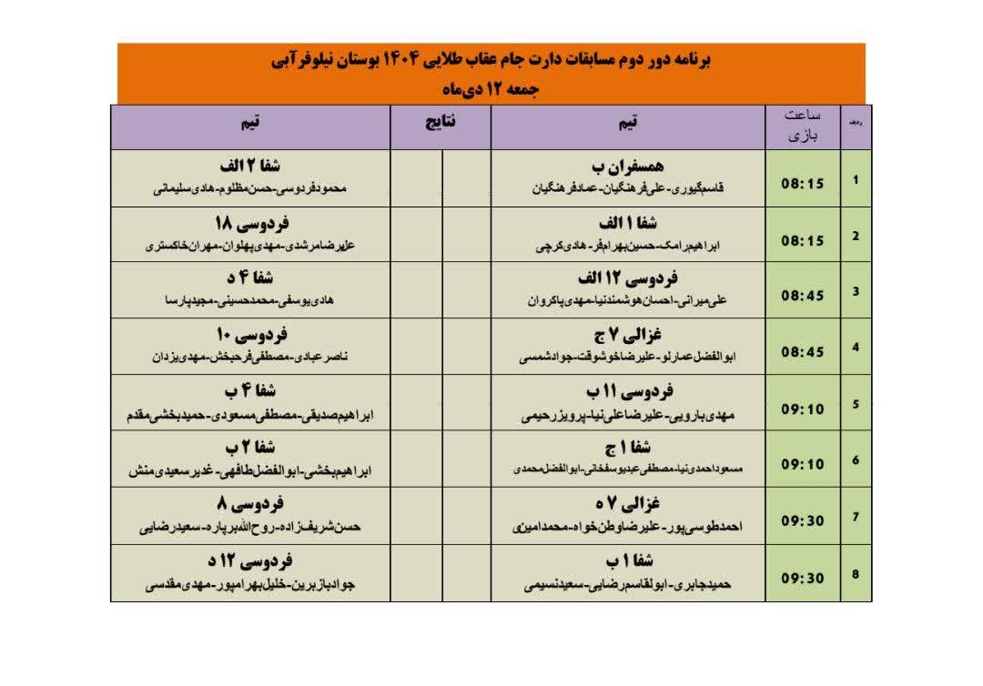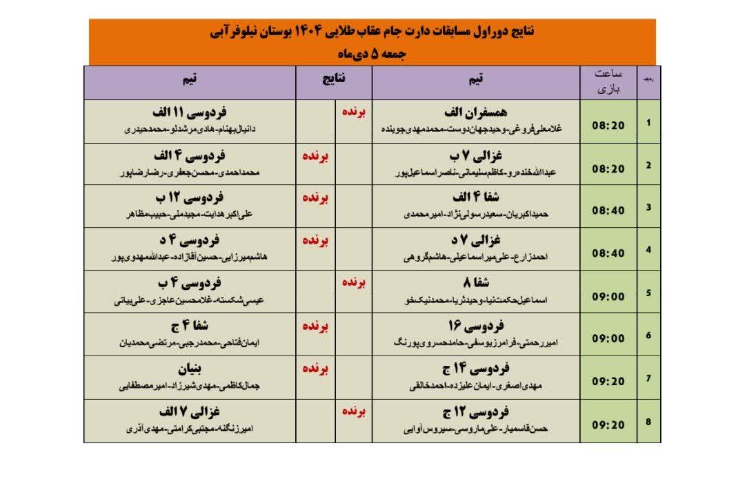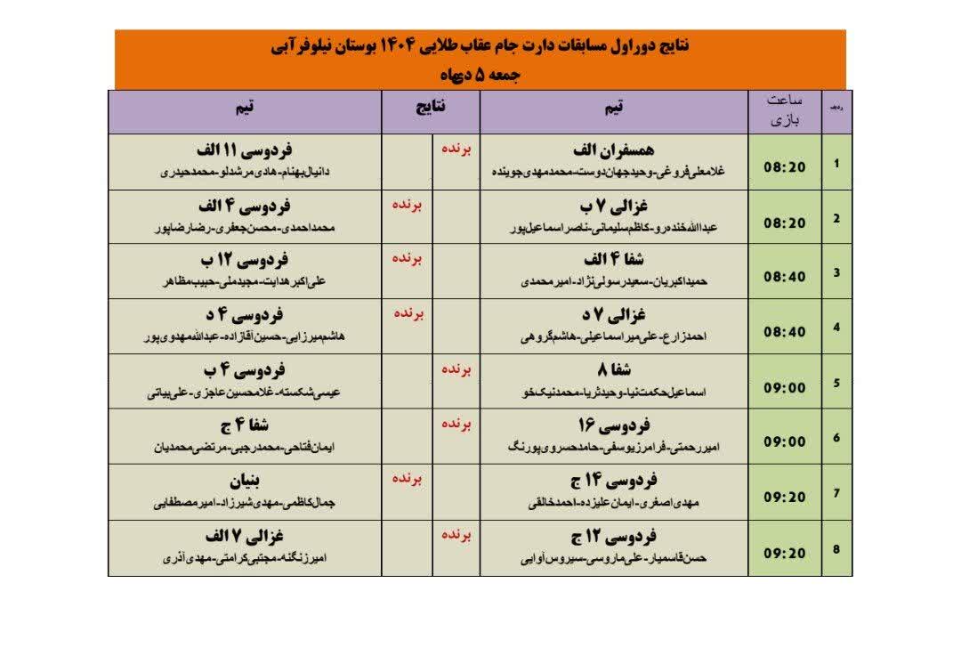 دور اول مسابقات دارت جام عقاب طلایی ۱۴۰۴ با انجام ۸ دیدار طبق جدول زیر روز جمعه ۵ دیماه در محل پارک نیلوفرآبی مشهد برگزار گردید.