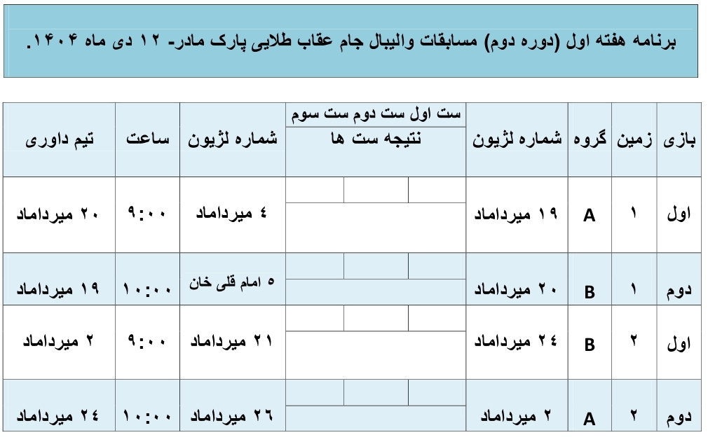 تربیت بدنی فعالیت های ورزشی پارک بوستان مادر اصفهان روز جمعه مورخ 5دی ماه1404 منبع: پارک مادر (اصفهان) جمعه 5 دي 1404 تعداد بازدید از این مطلب : 25 برنامه و نتایج مسابقات بدمینتون جام عقاب طلایی1404 برنامه و گروه بندی و نتایج مسابقات والیبال جام عقاب طلایی1404 برنامه و نتایج مسابقات فوتسال جام عقاب طلایی1404 مسابقات ورزشی تمامی رشته ها از طرف ایجنت محترم و مرزبانان بوستان مادر از حضور شما همسفران و مسافران و خدمتگزاران تشکر میکنیم و هفته خوبی را سپری کنید. تهیه و تنظیم:مسافر عباس عکاس:مسافر احسان و مسافر عباس ارسال:مسافر مهدی منبع: پارک مادر (اصفهان) جمعه 5 دي 1404 تعداد بازدید از این مطلب : 25 ویژه ها هشدار نایدا: وقفه در بروزرسانی و ارائه برخی از خدمات به دلیل وقفه در تأمین بودجۀ دولتی امریکا پذیرش مقاله مهندس حسین دژاکام برای ارائه در کنفرانس "مراقبت از اعصاب"،شیکاگو، امریکا (2026) گامی سرنوشتساز از سوی مهندس حسین دژاکام در درمان کووید-۱۹ و سارس مقاله "تأثیرات رفتاری و مولکولی پروتکل دی اس تی بر مدل حیوانی اعتیاد به تریاک" از مهندس حسین دژاکام، درصدر محافل علمی دنیا مورد بررسی و پذیرش قرار گر ارائه مقاله جدید و برجسته مهندس حسین دژاکام در حوزه درمان اعتیاد با روش DST با دقت سلولی مولکولی در کنفرانس بین المللی درمان اعتیاد در اورلاندو، فلوری دستاورد شگفتآور دیگری از تیم تحقیقاتی کنگره 60 در ریسرچ گیت منتشر گردید. دستاورد شگفت آور دیگری از کنگره 60، انتشار مقاله مهار متاستاز سرطان سینه به صورت short communication رویکردی نوین در درمان سرطان