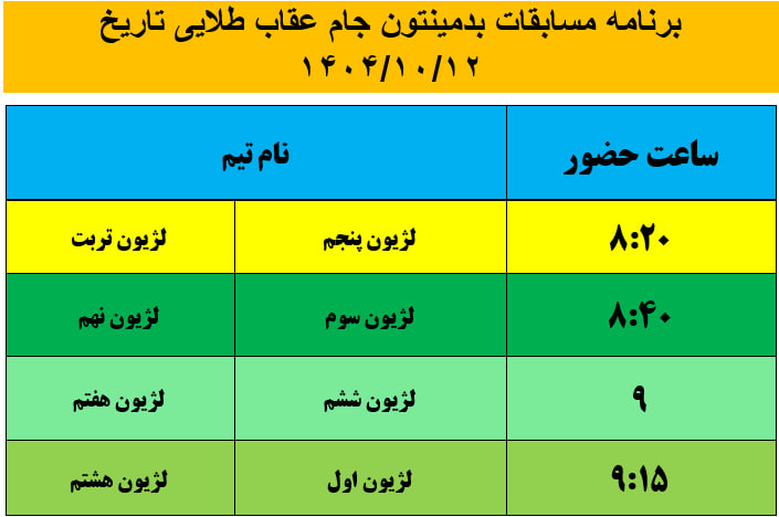 برنامه مسابقات بدمینتون جام عقاب طلایی به شرح جدول زیر اعلام می گردد: