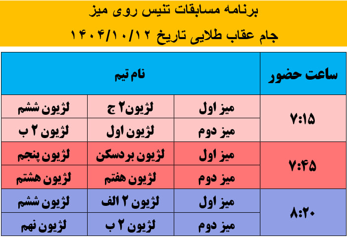 برنامه مسابقات تنیس روی میز جام عقاب طلایی به شرح جدول ذیل اعلام می گردد: