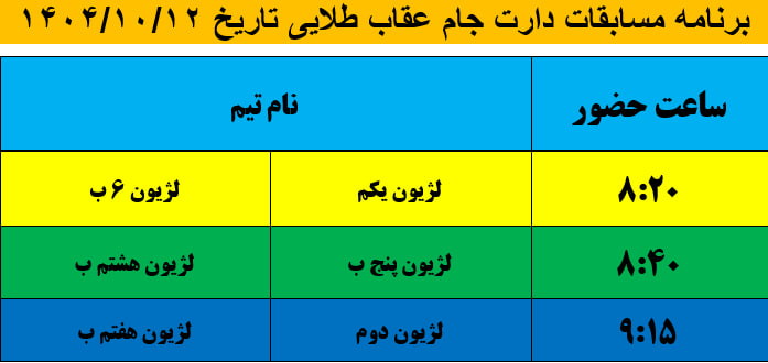 برنامه مسابقات دارت جام عقاب طلایی به شرح جدول ذیل اعلام می گردد: