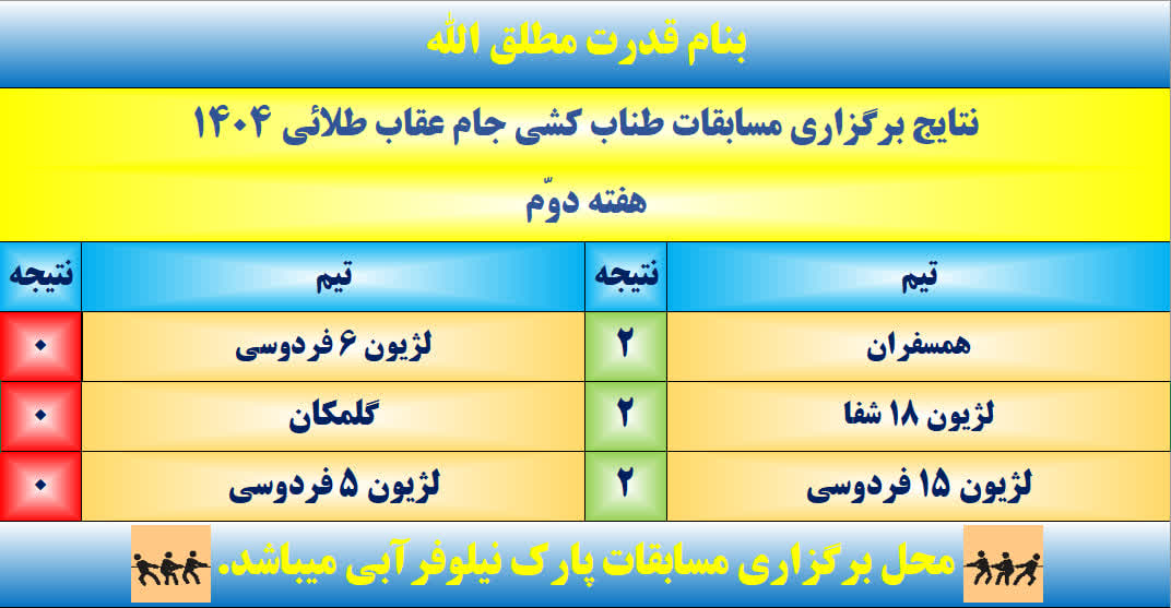 دومین هفته مسابقات طنابکشی جام عقاب طلایی در روز جمعه 12 دیماه ۱۴۰۴ با انجام ۳ دیدار برگزار و نتایج زیر بدست آمد.