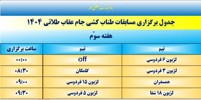هفته سوم این مسابقات روز جمعه 19 دیماه طبق جدول زیر برگزار میگردد.