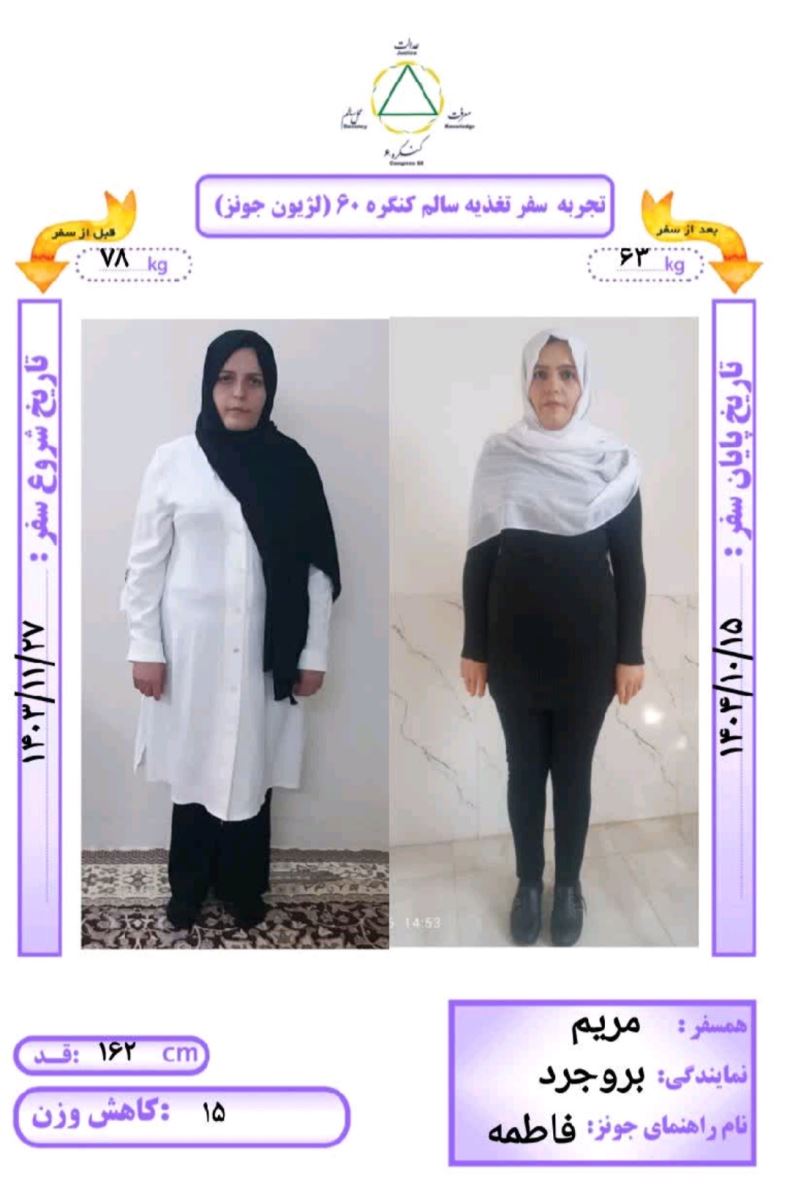 در روز دوشنبه ۱۵ دیماه ۱۴۰۴ همسفر مریم رهجوی راهنما همسفر فاطمه از نمایندگی بروجرد با قد ۱۶۲ سانتیمتر و وزن اولیه ۷۸ کیلوگرم به مدت ۱۰ ماه و ۱۸ روز به روش Dezhakam سفر کردند؛ ۱۵ کیلوگرم کاهش وزن داشتند و به وزن ۶۳ کیلوگرم رسیدند و با دستان پرمهر مهندس دژاکام آزاد و رها شدند.