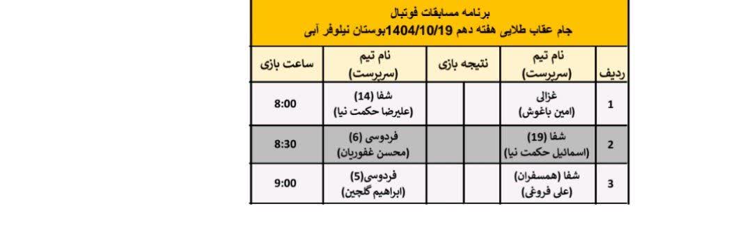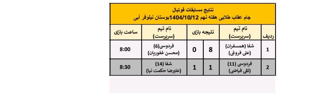هفته نهم مسابقات فوتبال جام عقاب طلایی ۱۴۰۴ با انجام ۲ بازی روز جمعه 12 دی ماه در بوستان نیلوفرآبی آغاز و نتایج زیر بدست آمد.
