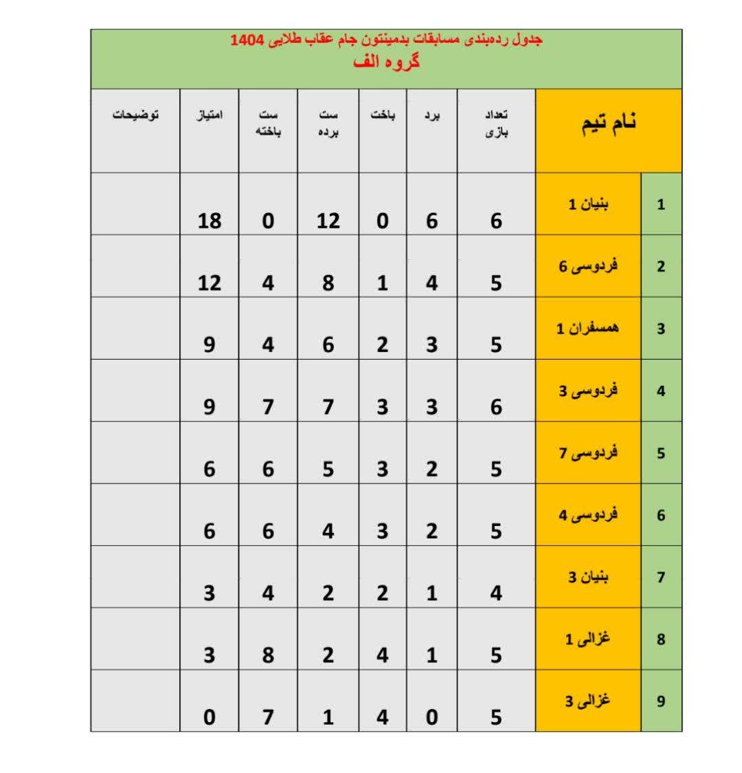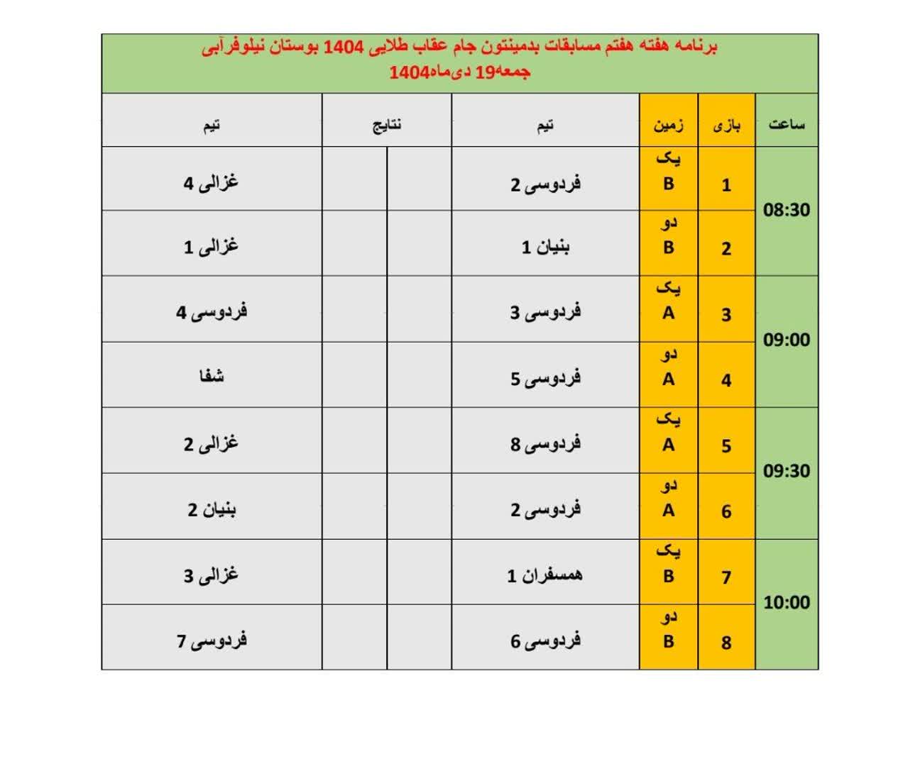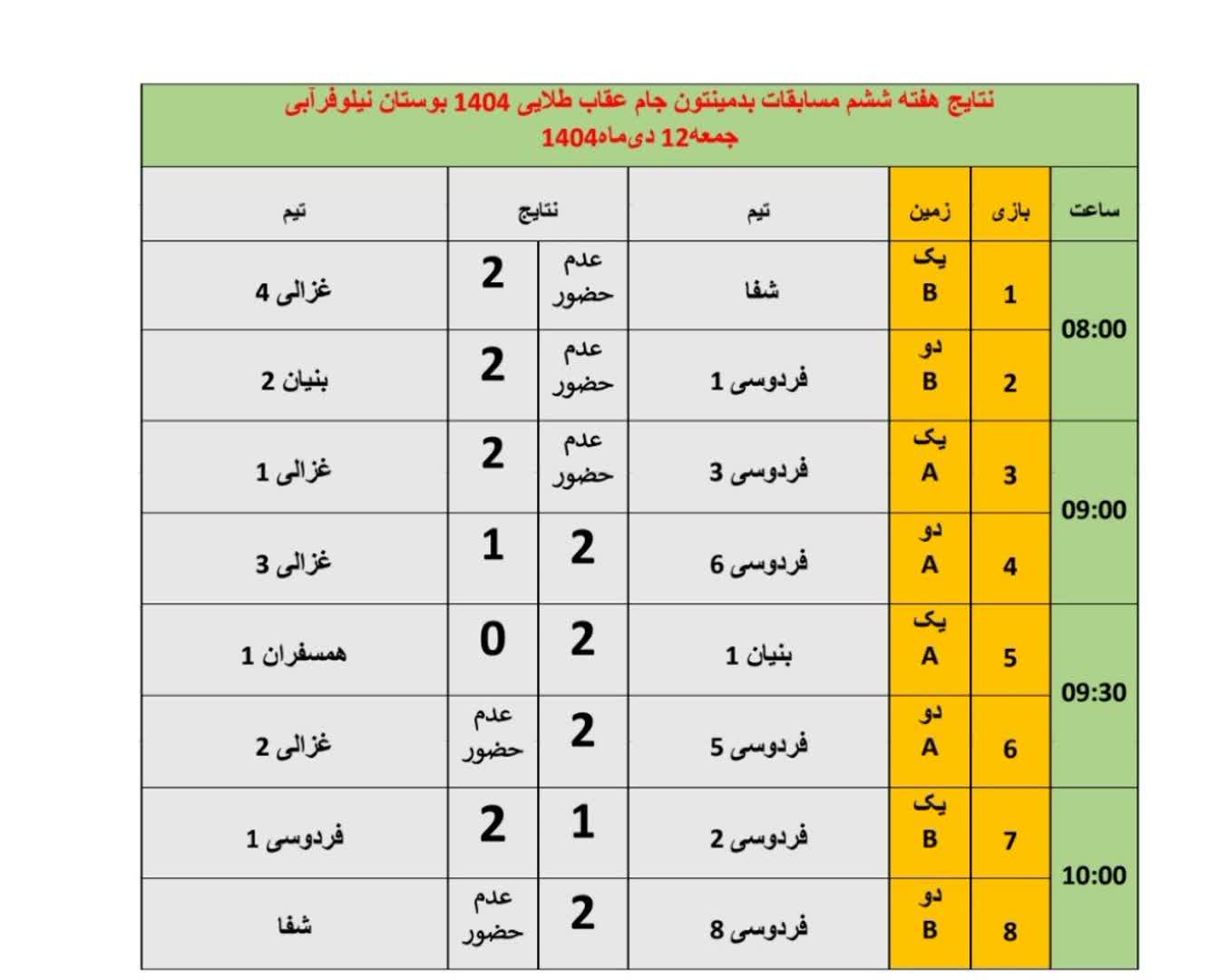 هفته ششم مسابقات بدمینتون جام عقاب طلایی ۱۴۰۴ بوستان نیلوفرآبی روز جمعه 12 دیماه پیگیری و نتایج زیر بدست آمد: