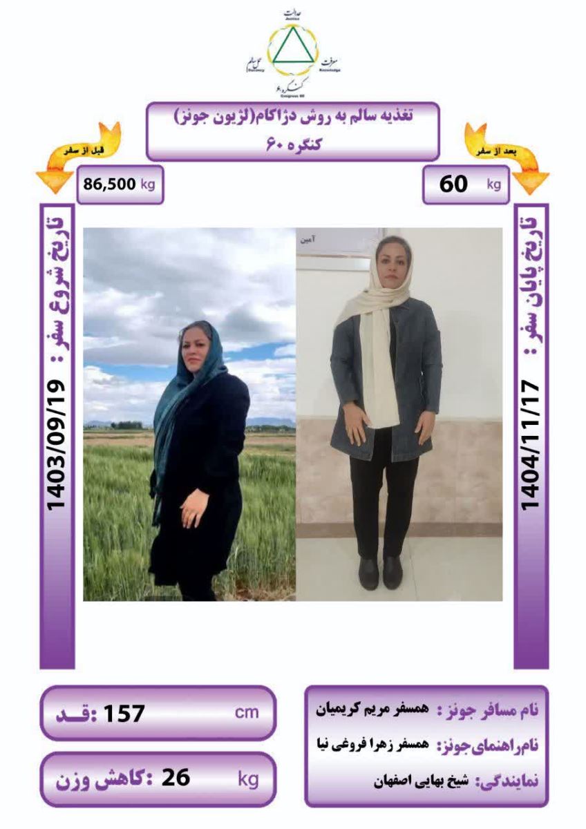 در روز جمعه ۱۷ آذرماه ۱۴۰۴ همسفر مریم رهجوی راهنما همسفر زهرا از نمایندگی شیخبهایی با قد ۱۵۷ سانتیمتر و وزن اولیه ۸۶/۵۰۰ کیلوگرم به مدت ۱۳ ماه و ۲۸ روز به روش Dezhakam سفر کردند؛ ۲۶ کیلوگرم کاهش وزن داشتند و به وزن ۶۰ کیلوگرم رسیدند و با دستان پرمهر آقای مهندس آزاد و رها شدند.