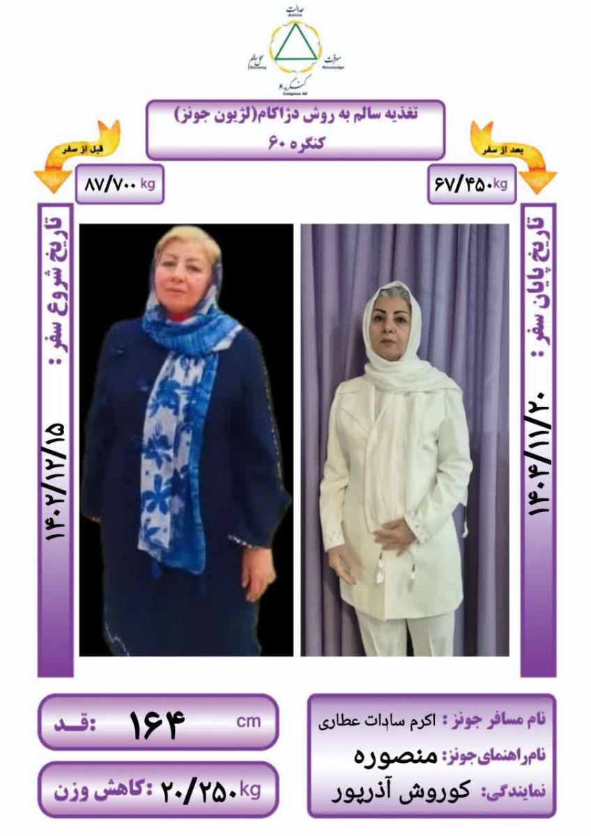 در روز دوشنبه ۲۰ بهمنماه ۱۴۰۴ همسفر اکرم سادات رهجوی راهنما همسفر منصوره از نمایندگی کوروش آذرپور با قد ۱۶۴ سانتیمتر و وزن اولیه ۸۷/۷۰۰ کیلوگرم به مدت ۱ سال و ۱۱ ماه و ۵ روز به روش Dezhakam سفر کردند؛ ۲۰/۲۵۰ کیلوگرم کاهش وزن داشتند و به وزن ۶۷/۴۵۰ کیلوگرم رسیدند و با دستان پرمهر آقای مهندس آزاد و رها شدند.