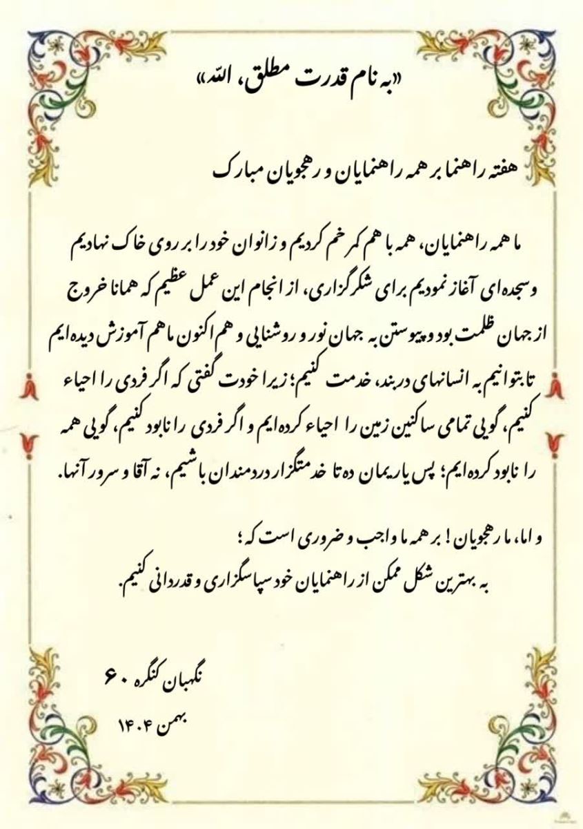 روز سهشنبه ۲۸ بهمنماه ۱۴۰۴ ساعت ۱۵:۰۰ مراسم تقدیر و تشکر از راهنمایان عزیز در نمایندگی شیخبهایی برگزار میگردد.