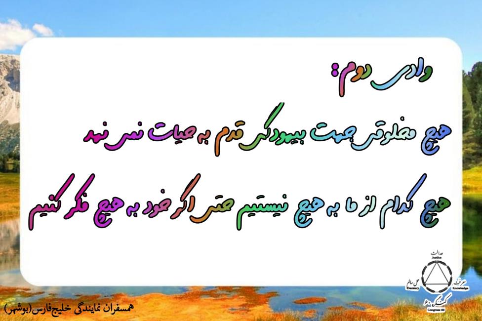 دستور جلسات هفتگي صفت انسان پذیرای دگرگونی است 11 آذر همسفر سمیه در مورد دستور جلسه نوشت: وادی دهم؛ به انسان همزمان شور و امید میبخشد و او را نسبت به خطرات آگاه میسازد.