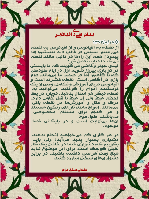 دلنوشته همچنان نور امید در دلم روشن است 4 مهر همسفر نعیمه در دلنوشته خود چنین نوشت: انسان میتواند تغییر نماید و سرنوشتها با خواست انسان رقم زده میشود.