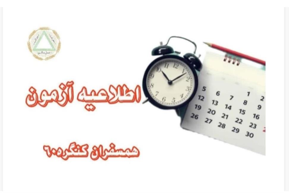 اخبار داخلی اطلاعیه آزمون داخلی همسفران 26 بهمن آزمون داخلی شماره ۱۲ روز* یکشنبه * ۱۴۰۴/۱۲/۱۷ راس ساعت ۱۴:۳۰ دقیقه بصورت حضوری در نمایندگی برگزار میشود.