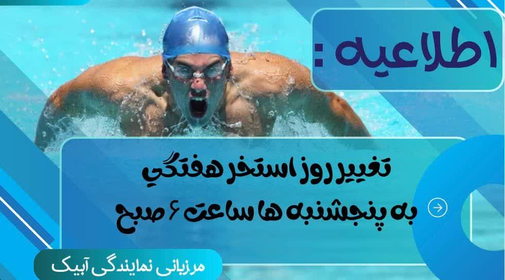 به اطلاع می رساند از این هفته استخر به روزهای پنجشنبه صبح ساعت ۶ بامداد موکول گردیده است