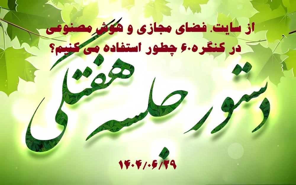 دستور جلسات هفتگي از سایت، فضای مجازی و هوش مصنوعی در کنگره ۶۰ چگونه استفاده می کنیم؟ 29 شهريور این هفته را به تمامی خدمتگزاران صور پنهان کنگره 60، سایت و فضای مجازی تبریک میگویم.