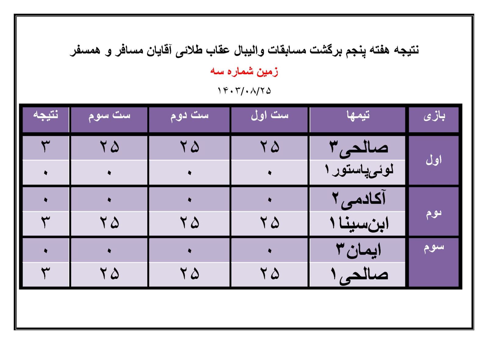 *کلیه سرپرستهای تیمها و اعضای آن موظف به معرفی و حضور تیم کامل داوری اعم از داور اول و دوم، داوران خط و منشی مسابقه و شمارهانداز هستند.لازم به ذکر است برای انجام هر گونه هماهنگی در امور داوری به نگهبان محترم داوری والیبال مسافر مهدی شاهرودی مراجعه یا با شماره ۰۹۱۲۱۷۷۷۹۰۵ تماس حاصل نمایند.