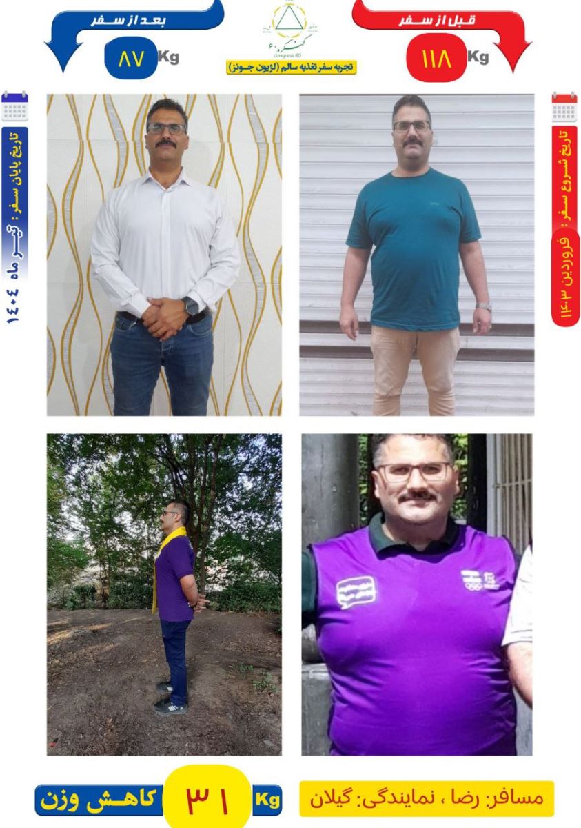 امروز، وزنم از ۱۱۸ به ۸۸ کیلوگرم رسیده است. کبد چرب گرید ۲ درمان شده، تعریق شدید، خستگی، کمردرد و حس خفگی شبانه دیگر جایی در زندگیام ندارند. لباسپوشیدن راحتتر شده، عزتنفس برگشته و مهمتر از همه، آرامش درونی جایگزین اضطراب شده است. حسی عمیق که نیرویی بالا، همیشه مرا به جلو میبرد. این را مدیون کنگره ۶۰، آقای مهندس حسین دژاکام و راهنمای عزیزم آقای ارسلان هستم.