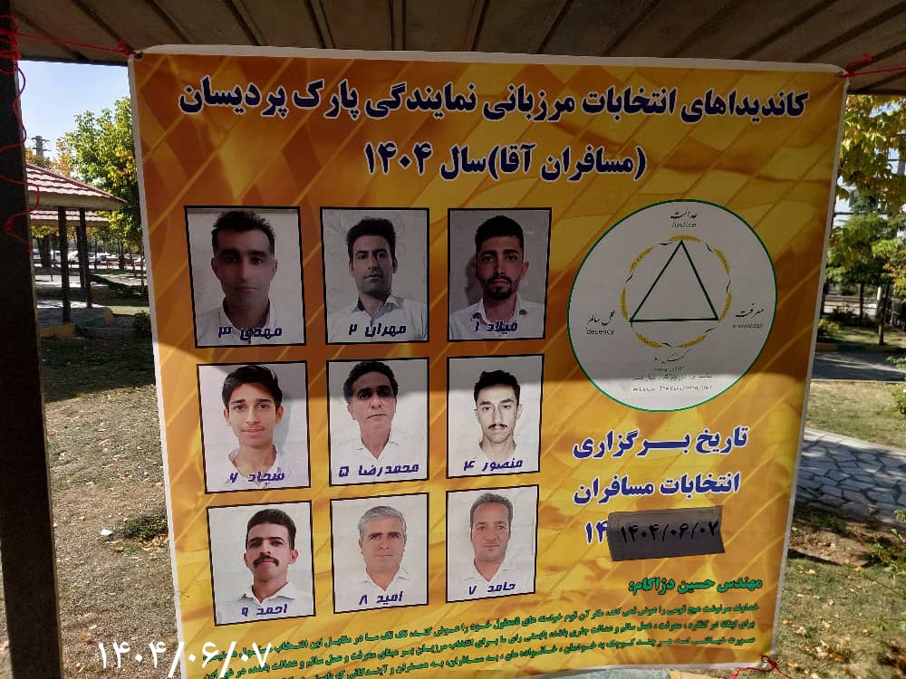 روز جمعه ۱۴۰۴/۰۶/۰۷ انتخابات مرزبانی آقایان مسافر و همسفر پارک پردیسان برگزار گردید و مسافر؛ مهران، حامد، امید، منصور و همسفر سجاد بعنوان مرزبان دوره دوم این نمایندگی انتخاب شدند.