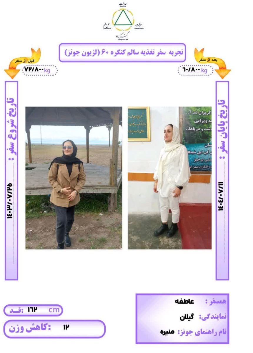 در روز جمعه ۱۱ مهر ۱۴۰۴ همسفر عاطفه رهجوی راهنما همسفر منیره نمایندگی گیلان با قد ۱۶۲ و وزن اولیه ۷۲/۸۰۰ کیلوگرم به مدت ۱۱ ماه و ۱۶ روز به روش DST سفر کردند؛ ۱۲ کیلوگرم کاهش وزن داشتند و به وزن ۶۰/۸۰۰ کیلوگرم رسیدند و با دستان پرتوان آقای مهندس آزاد و رها شدند.