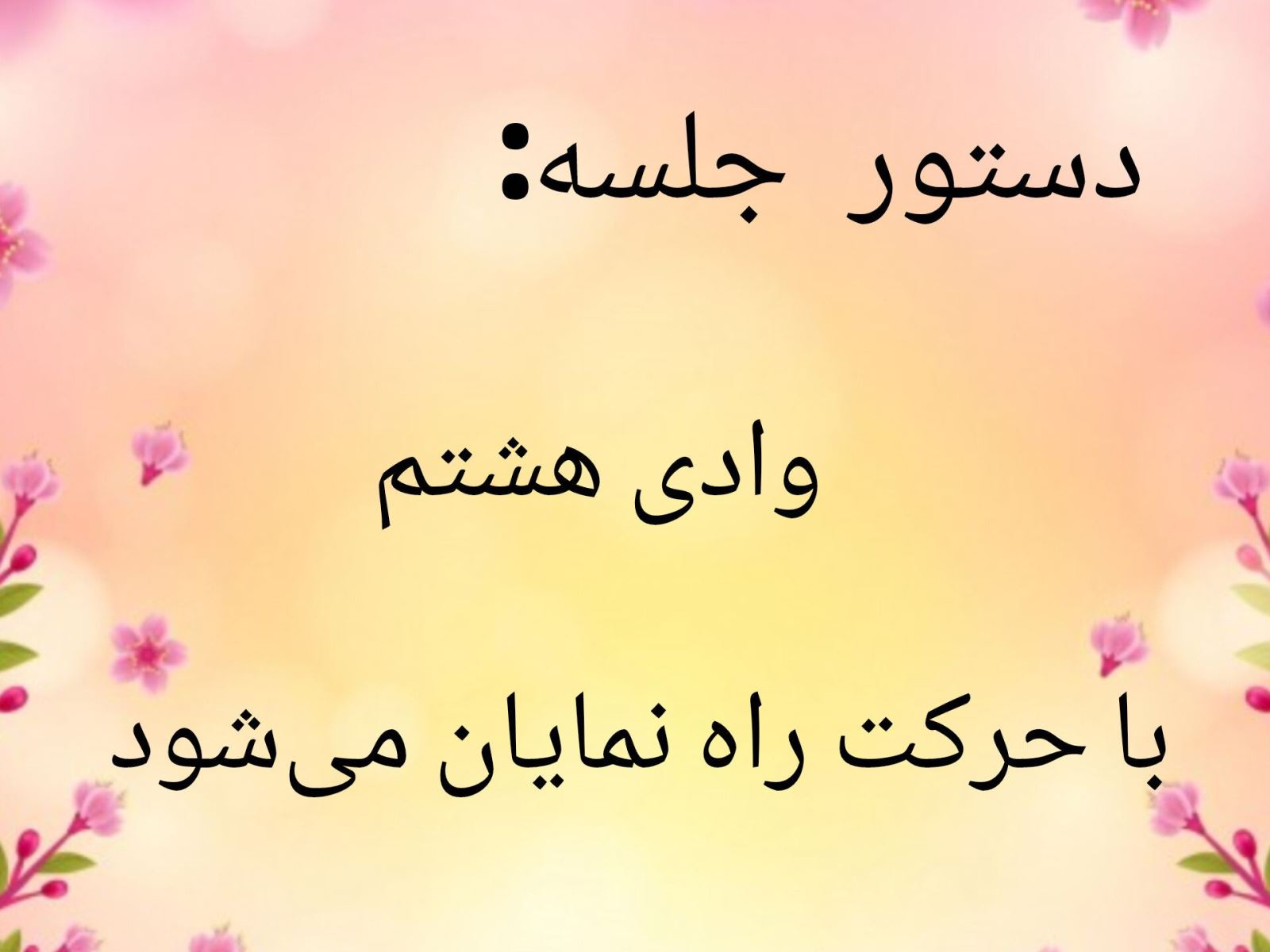 از خداوند متعال و آقای مهندس دژاکام و خانواده محترمشان که این بستر را برای ما فراهم نمودند سپاسگزارم. از ایجنت محترم، گروه مرزبانی و راهنمایان محترم آقای خاشعی و آقای شهابی که اجازه دادند من در این جایگاه خدمت نمایم نیز تشکر میکنم. دستور جلسه هفته وادی هشتم (با حرکت راه نمایان میشود) بنای حرکت تغییر وضعیت است منظور این است که باید جایگاه خود را تغییر دهیم شخصی که میخواهد کنکور دهد با درس خواندن جایگاه خود را تغییر میدهد و در کنکور شرکت مینماید. سکون برابر سقوط است و با آن هیچ زایشی پدید نمیآید، این حرکت است که بالندگی و پویایی میدهد. یکی از حرکتها در سفر اول آموزش گرفتن وادیها است، با حرکت راه برای ما نمایان میشود. وادی هشتم جهانبینی کاربردی را نشان میدهد، هنگامیکه وارد راه شدی علائم و تابلوها مسیر درست را به ما نشان خواهند داد.