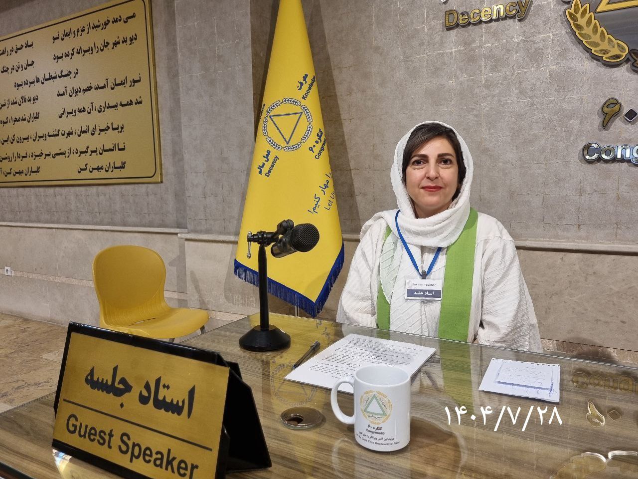 از ایجنت شعبه و مرزبانان تشکر میکنم که به من این اجازه را دادند تا در این جایگاه خدمت کنم. درمورد جهان بینی ورزش من یکسری مطالب را به صورت دیکتهوار درآوردم که اگر بگویم ورزش چه فوایدی دارد؛ خیلی چیزها را، خیلی جاها میخوانیم و میبینیم، اینکه ورزش باعث شادابی پوست میشود و باعث سلامت جسم میشود، عملکرد حافظه را بالا میبرد، به خواب ما بهبود میدهد و باعث پیشگیری از سرطان میشود، از فرسایش قد جلوگیری میکند زیرا هر چه سن بالا برود قد کوتاهتر میشود به نسبت چون بدن ماهیچهسوزی میکند؛ تنها کاری که میتواند جلوی این روند را بگیرد ورزش کردن میباشد و اینکه خانمها از یک سنی تقریباً ۳۰ به بعد عضلهسوزی در بدن دارند و عضلات آنها میسوزد یعنی رشد عضله ندارند و معکوس عمل میکند مگر اینکه ورزش بکنیم؛ ورزش هم عموماً این نیست که از صبح که از خواب بیدار میشویم و یک سری فعالیت های روزمره انجام می دهیم ورزش نام داشته باشد، اتفاقاً اینها فرسایشی می باشد و بدن را نابود میکند حتی اگر کوچکترین حرکت ورزشی نداشته باشیم و بدن به همین منوال بماند بعد از مدتی خطرناک میباشد؛ ما هر بار ورزش میکنیم تا دوازده ساعت چربی سوزی داریم و اینکه در لژیون جونز اجباری است که حتماً پیاده روی بکنیم تا به وزن ایده آل خود برسیم. یک مقدار هم در مورد زنان میخواهم صحبت کنم، دربارهی ورزش و اینکه زنان چگونه موجوداتی هستند؟ ما زنان در کلام اللّه خواندم که به کشتزارهایی تشبیه شدهاند که هر چه در آن زمین بکاری میتوانی کشت کنی؛ هر چیزی که از یک نطفه گرفته شده است نوزاد تحویل میدهد و از مواد غذایی یک غذای خوب میسازد. اصولاً زن شخصیت سازندگی دارد و حال اینکه من به عنوان یک زن فقط خدمت کنم و به وجود خودم فکر نکنم به چه صورت میتوانم از این جسم نگهداری کنم؟ به نظر من یک نقص میباشد؛ من از بچگی ورزش کردهام ولیکن این نکته را در کنگره آموختم: اینکه به خودم هم باید توجه کنم. ورزش میکردم، رقابت میکردم، لذت میبردم ولی توجه به وجود خودم نداشتم، به اینکه چرا دارم ورزش میکنم؟ فقط لذت میبردم، سلامتی هم داشتم ولی یک جایی بیماری سخت گرفتم با این که ورزشکار هم بودم و صبح تا شب در استخر بودم ولی بیماری سختی گرفتم و یک جایی در کنگره متوجه شدم که مشکل از جای دیگری میباشد و آن تفکر است که مشکل دارد. مثلث درمان، جسم را، رأس مثلث قرار داده است: جسم، روان و جهانبینی یعنی اگر این جسم نقص داشته باشد، تفکر درست عمل نمیکند، روان درست عمل نمیکند، من مفاهیم را درست متوجه نمیشوم یعنی مفاهیم برای من باز نمیشود تا وقتی که مغز من در حالت نرمال نباشد و هورمونها در مغز درست ترشح نشود این مفاهیم برای من باز نمیشود و طول میکشد تا من متوجه شوم. یکی از مسائلی که ورزش آن را تنظیم میکند مسئلهی خواب میباشد، چون خواب خیلی مسئلهی مهمی میباشد؛ من مادرم را تقریباً بیست سال میشود که از دست دادهام، زن خیلی قوی بود، خیلی کار میکرد، ولی سر همین خواب که خواب خیلی کمی داشت عمر کوتاهی داشت و این برای من درس بزرگی بود من قبلاً هم که ورزشکار بودم و بیمار شدم ممکن است دوباره این اتفاق برای من بیفتد؛ اینکه من ظاهر آراسته داشته باشم نمیتواند من را تأمین بکند و من را پوشش بدهد، تنها چیزی که میتواند تا آخر عمر مرا پوشش بدهد جسم سالم میباشد و این به جز ورزش کردن به دست من نمیآید.