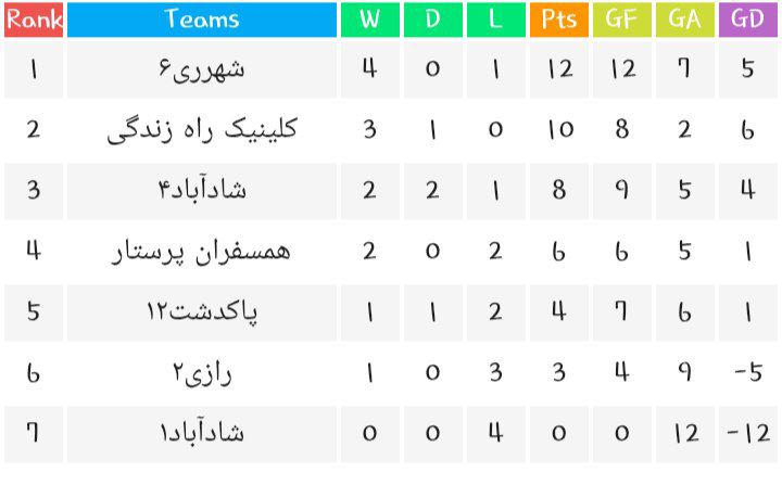 برنامه هفته ششم ونتایج هفته پنجم وجدول مسابقات فوتبال کنگره ۶۰ (بوستان ولایت)