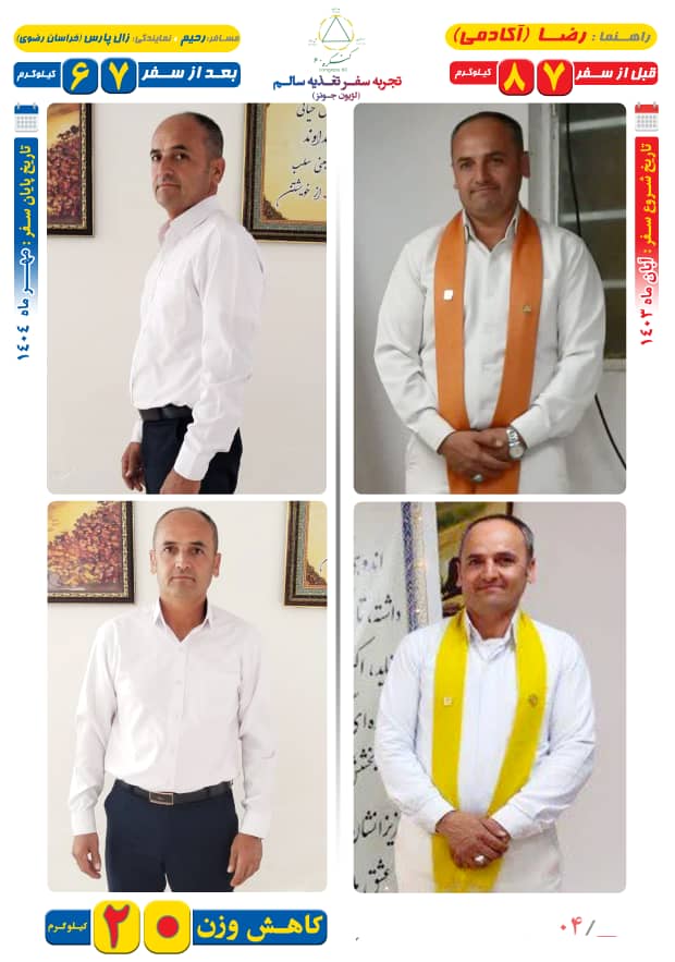 من حدود ۱۰ ماه در سفر کاهش وزن بودم، به روش جناب مهندس دژاکام و با راهنمایی راهنمای عزیزم، آقا رضا، و موفق شدم ۲۰ کیلوگرم وزن کم کنم.