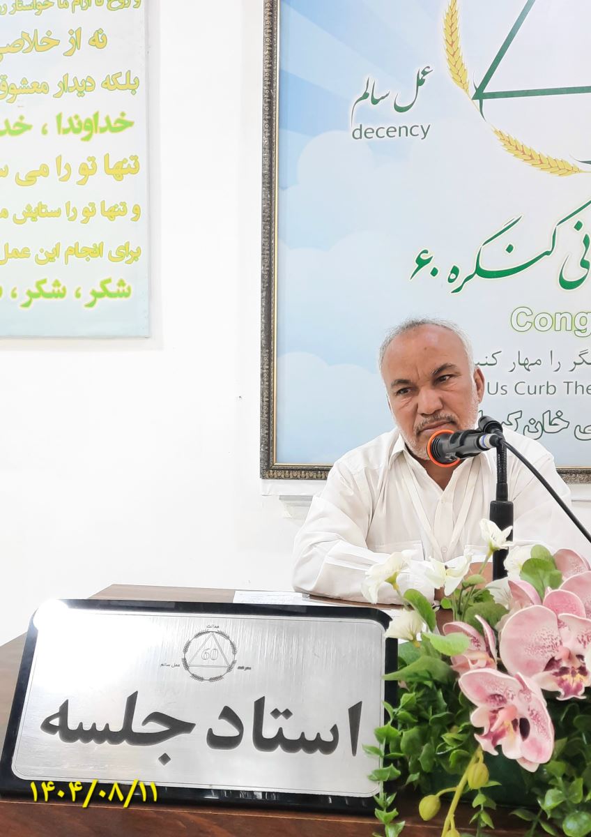 خداوند را سپاسگذارم که یک روز دیگر در جمع شما دوستان هستم و این جایگاه را تجربه میکنم و تشکر میکنم از بنیان کنگره۶۰ آقای مهندس دژاکام و همچنین راهنمای درمان موادم آقا حسام و آقای عمار راهنمای تازه واردین و همچنین از ایجنت محترم، مرزبانان،راهنمایان و خدمتگذاران محترم کنگره ۶۰.