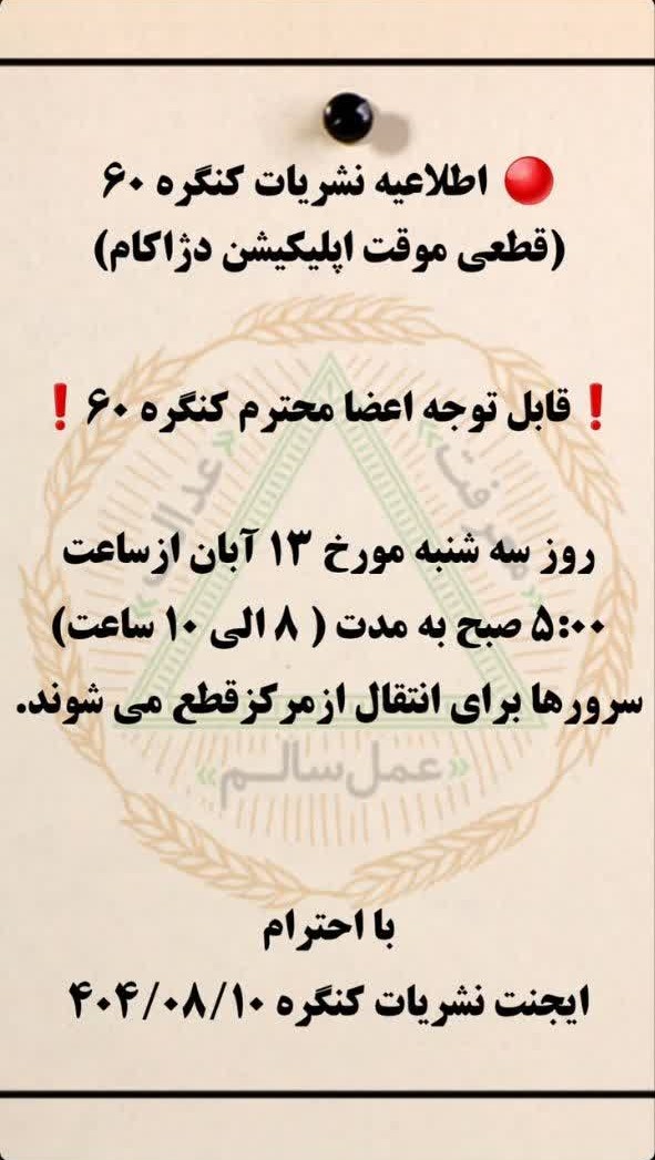 روز سه شنبه مورخ ۱۳آبان ازساعت ۵:۰۰ صبح به مدت ( ۸ الی ۱۰ ساعت) سرورها برای انتقال ازمرکزقطع می شوند.