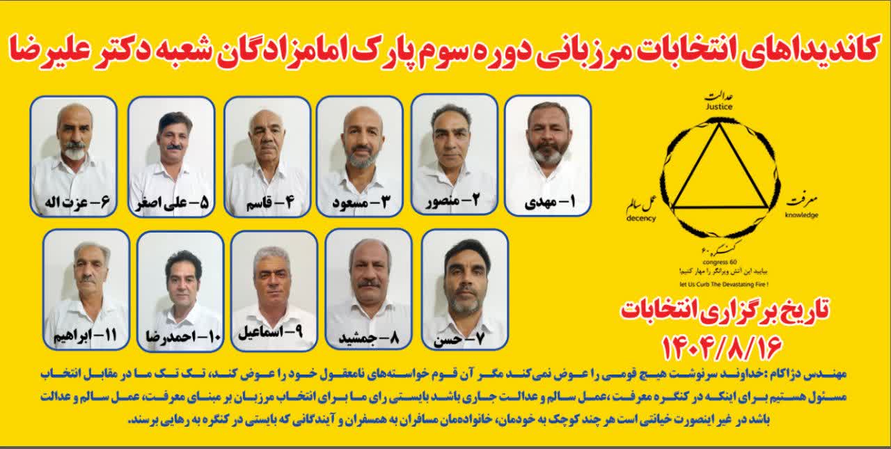 به اطلاع کلیه مسافران عزیز میرساند، روز جمعه مورخ 16 آبان ماه ۱۴۰۴ ساعت 09:۰۰ سومین دوره انتخابات مرزبانی پارک امامزادگان زیباشهر برگزار می گردد.