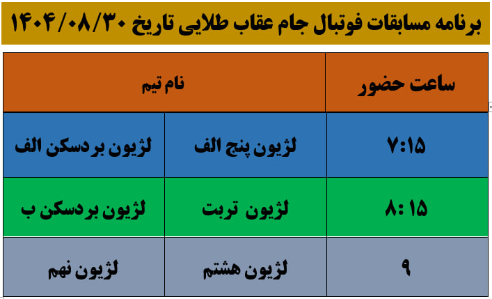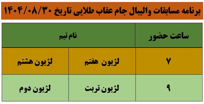 🟣 رقابت های هفته اینده مورخه ۱۴۰۴/۰۸/30 به شرح زیر اعلام می گردد: