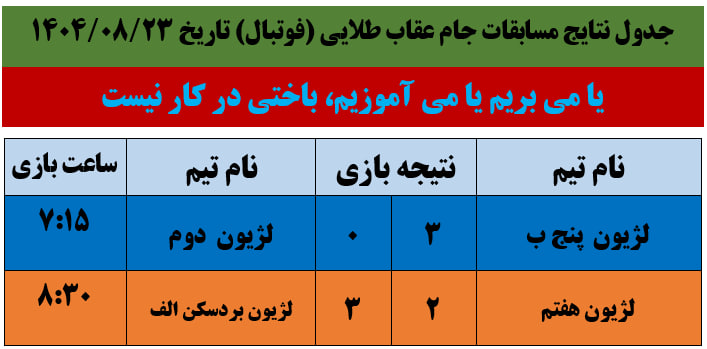 ⚽️ هفته چهارم مسابقات فوتبال جام عقاب طلایی پارک بسیج نمایندگی کاشمر روز جمعه ۱۴۰۴/۰۸/23 با انجام دو بازی آغاز گردید که نتایج آن به شرح زیر می باشد: