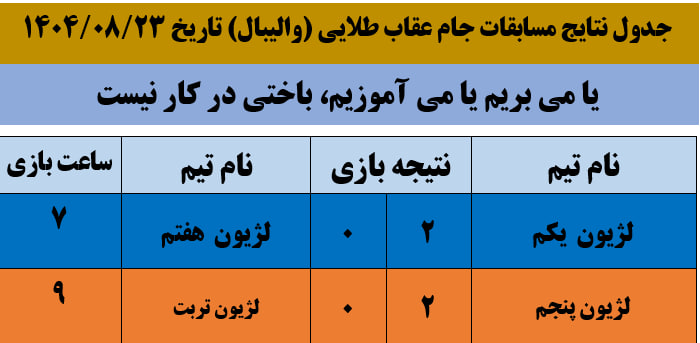 🏐 هفته سوم مسابقات والیبال جام عقاب طلایی پارک بسیج نمایندگی کاشمر روز جمعه ۱۴۰۴/۰۸/23 با انجام دو بازی آغاز گردید که نتایج آن به شرح زیر می باشد: