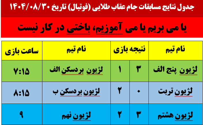⚽️ هفته پنجم مسابقات فوتبال جام عقاب طلایی پارک بسیج نمایندگی کاشمر روز جمعه ۱۴۰۴/۰۸/30 با انجام سه بازی آغاز گردید که نتایج آن به شرح زیر می باشد: