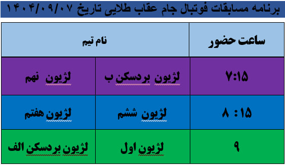 🟣 رقابت های هفته اینده مورخه ۱۴۰۴/09/07به شرح زیر اعلام می گردد: