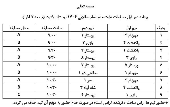 تربیت بدنی برنامه مسابقات دارت جام عقاب طلایی کنگره 60(بوستان ولایت) منبع: پارک ولایت (تهران) سه شنبه 4 آذر 1404 تعداد بازدید از این مطلب : 272 جدول تیم های شرکت کننده --------------------- برنامه دور اول مسابقات دارت جام عقاب طلایی بوستان ولایت(کنگره 60) مورخ 1404/09/07 با تشکر نگهبان دارت بارگذاری: مرزبان خبری (مسافر رحمان) منبع: پارک ولایت (تهران) سه شنبه 4 آذر 1404 تعداد بازدید از این مطلب : 272 ویژه ها هشدار نایدا: وقفه در بروزرسانی و ارائه برخی از خدمات به دلیل وقفه در تأمین بودجۀ دولتی امریکا پذیرش مقاله مهندس حسین دژاکام برای ارائه در کنفرانس "مراقبت از اعصاب"،شیکاگو، امریکا (2026) گامی سرنوشتساز از سوی مهندس حسین دژاکام در درمان کووید-۱۹ و سارس ارائه مقاله جدید و برجسته مهندس حسین دژاکام در حوزه درمان اعتیاد با روش DST با دقت سلولی مولکولی در کنفرانس بین المللی درمان اعتیاد در اورلاندو، فلوری مقاله "تأثیرات رفتاری و مولکولی پروتکل دی اس تی بر مدل حیوانی اعتیاد به تریاک" از مهندس حسین دژاکام، درصدر محافل علمی دنیا مورد بررسی و پذیرش قرار گر دستاورد شگفتآور دیگری از تیم تحقیقاتی کنگره 60 در ریسرچ گیت منتشر گردید. دستاورد شگفت آور دیگری از کنگره 60، انتشار مقاله مهار متاستاز سرطان سینه به صورت short communication رویکردی نوین در درمان سرطان