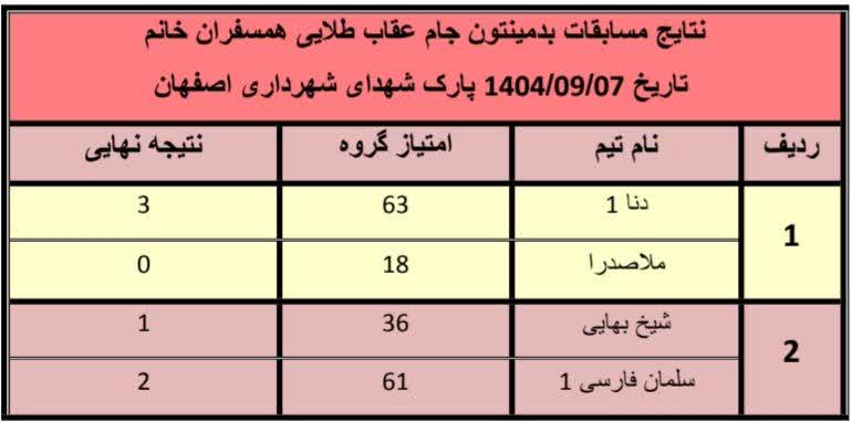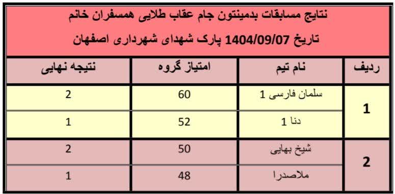 نتایج مسابقات بدمینتون جام عقاب طلایی همسفران خانم کنگره۶۰ در روز جمعه 1404/09/07 پارک شهدای شهرداری اصفهان