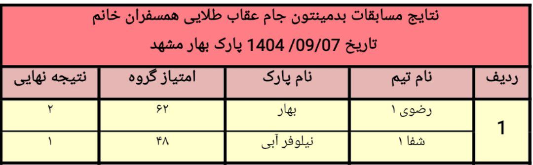 نتایج مسابقات بدمینتون جام عقاب طلایی همسفران خانم کنگره۶۰ در روز جمعه ۱۴۰۴/۰۹/۰۷ در پارک بهار مشهد