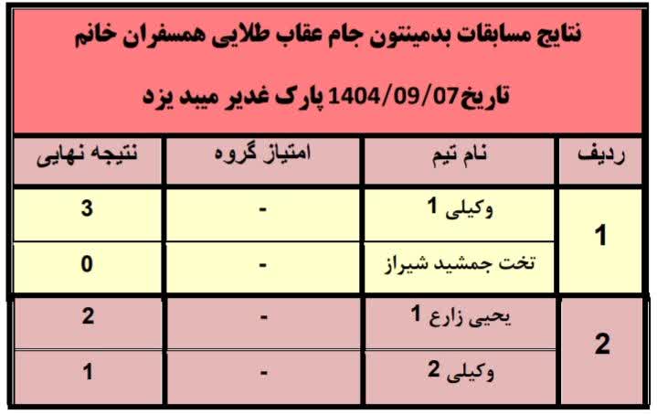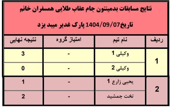 نتایج مسابقات بدمینتون جام عقاب طلایی همسفران خانم کنگره۶۰ در روز جمعه 1404/09/07 پارک غدیر میبد یزد