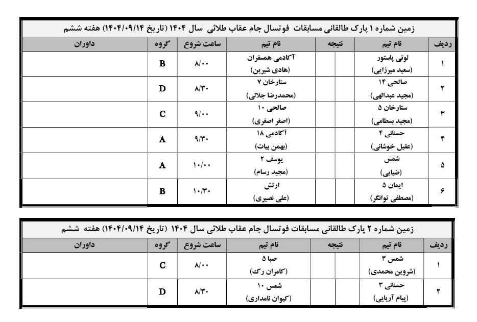 برنامه بازی های هفته ششم مسابقات فوتبال جام عقاب طلائی 1404، نمایندگی پارک طالقانی در تاریخ 1404/09/14 طبق جدول زیر، در زمینهای شماره 1 و 2 برگزار خواهد گردید.